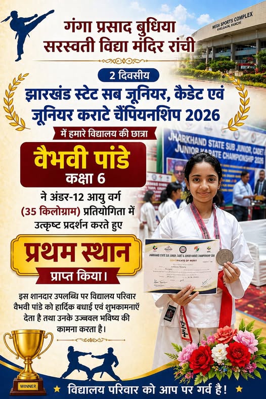 Vaibhavi Pandey, a student of Ganga Prasad Budhia Saraswati Vidya Mandir, Ranchi, has brought glory to her school in the world of sports. She secured the first position with an outstanding performance at the Jharkhand State Sub-Junior, Cadet, and Junior Karate Championship 2026.